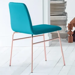 Metal legs lacquered in a selection of colours or plated brush or shiny copper, brass or champagne gold, upholstery in a selection of fabrics or leather