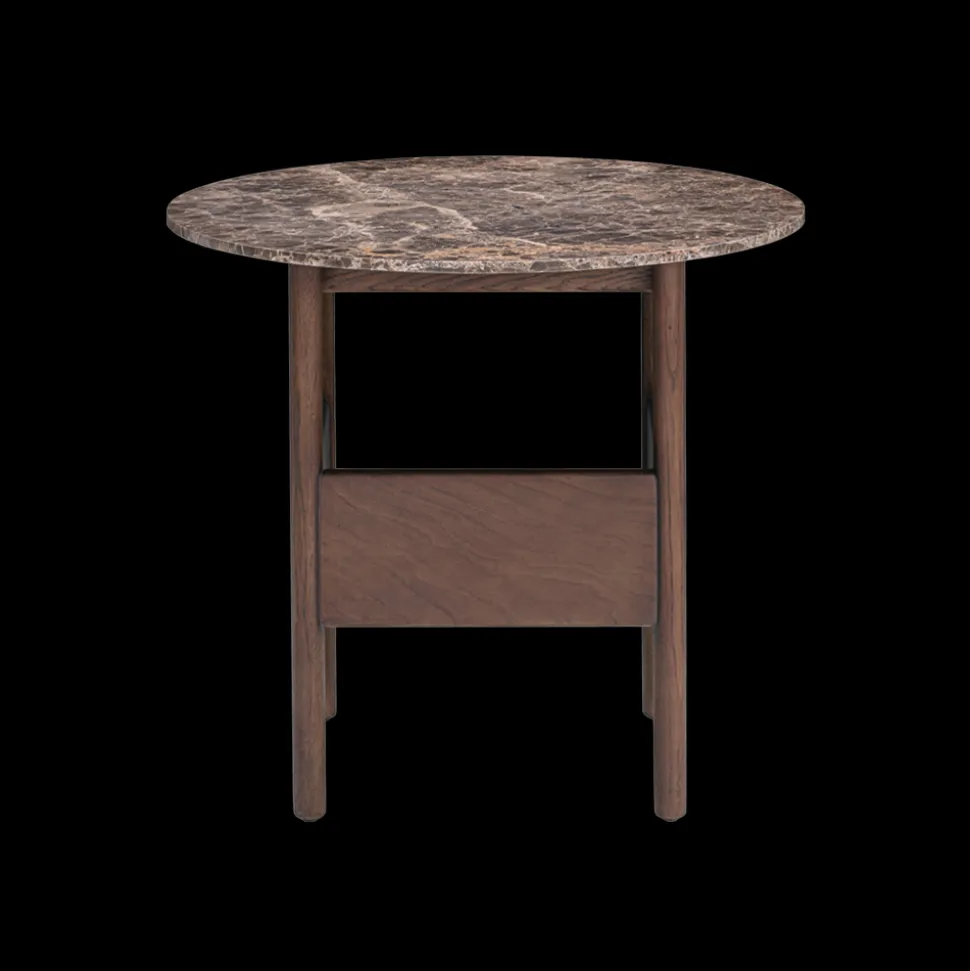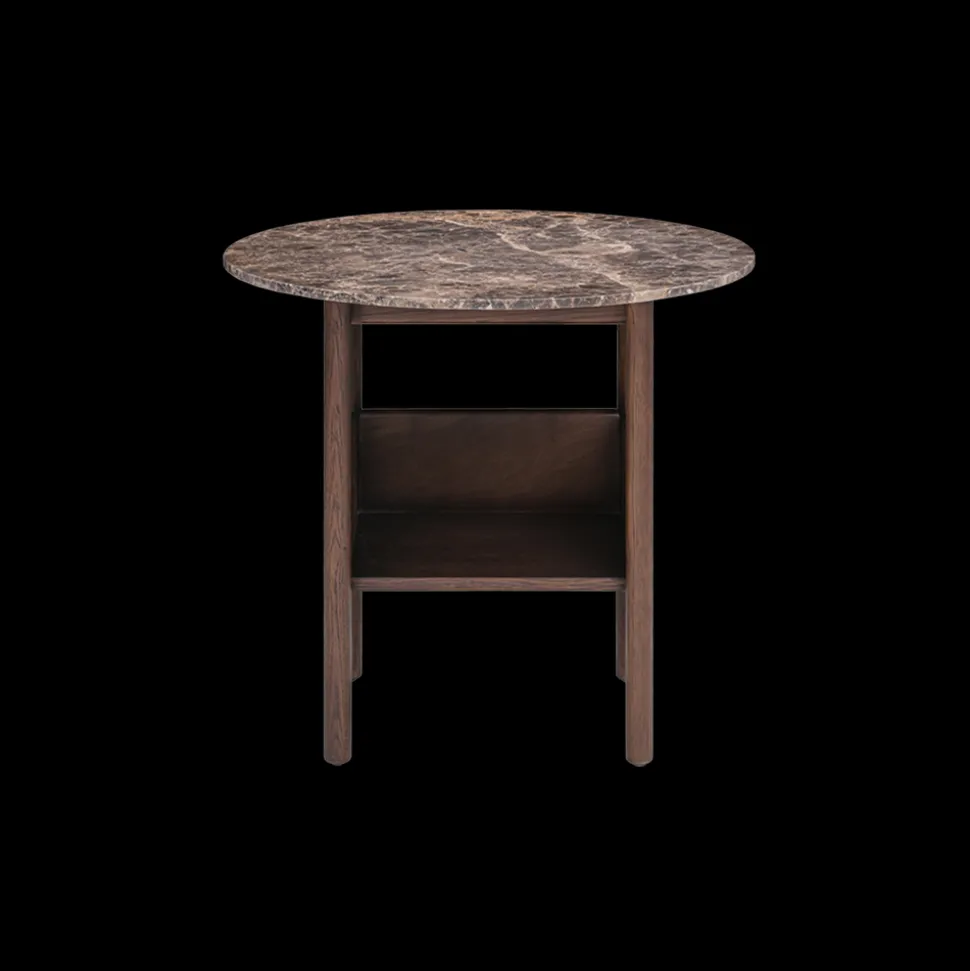 Base in solid oak with oak veneer stained dark brown, top in brown emperador marble