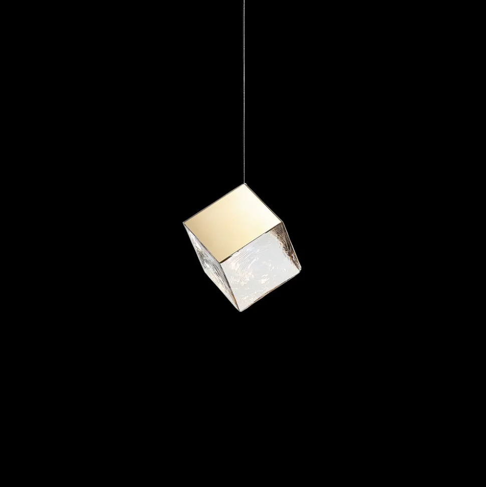 The sculptural structures of minerals and their perfectly smooth surfaces are among the most precious treasures from the very core of the Earth, only revealing their optical magic once they encounter a source of light. This Bomma collection was inspired by pyrite, the golden fire-stone in the shape of a perfect cube, while the silver version of the shade reflects its inspiration in salt crystals. By blowing a molten organic substance into a precise cold form, the skilled hands of our glassmakers create a unique light fixture of elemental, yet perfect shape. The gleaming surface of this hand-blown crystal cube is enclosed from three sides by a polished metal component in either silver or gold tones. The Pyrite Collection excels in both exceptional design and top-quality materials. Easily combined, it invites you to create your own unique lighting constellations.