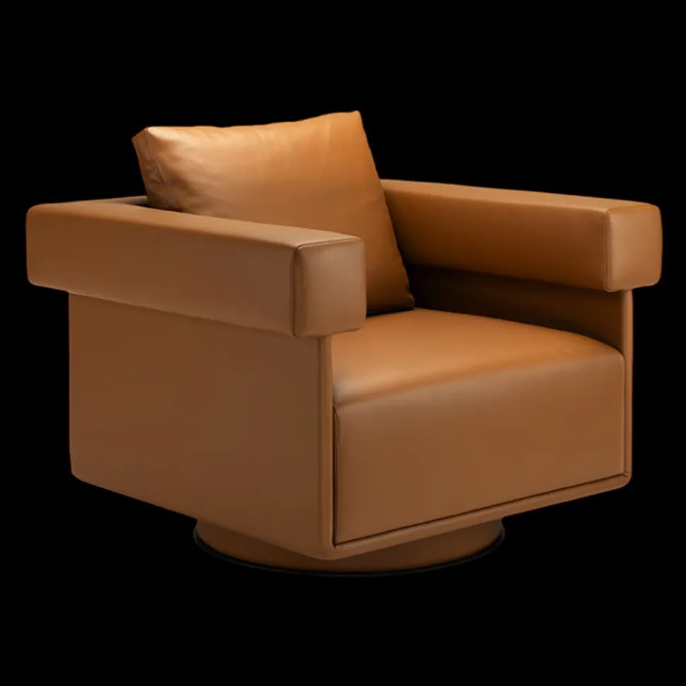 The CUBE armchair, with its block-like form and absence of curved lines, embodies the Bauhaus movement’s core principles of simplicity and geometric design. This chair achieves a perfect balance between aesthetics and functionality. Its swivel base enhances practicality, offering smooth rotation, making CUBE an ideal choice for both residential and office environments.