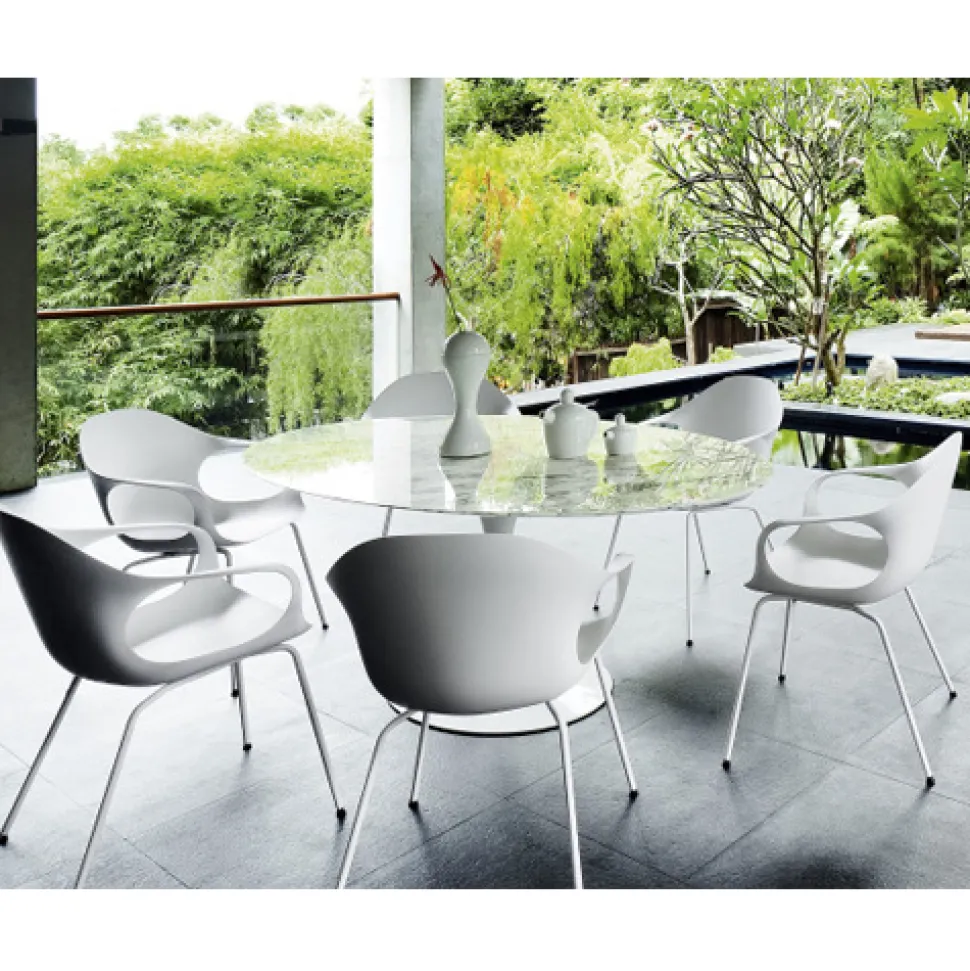 Metal legs in chrome, satin chrome or lacquered in matching seat colour, polyurethane seat in white, beige, black, terracotta brown, brown, olive green or light blue, optional removable seat cushion upholstered in fabric