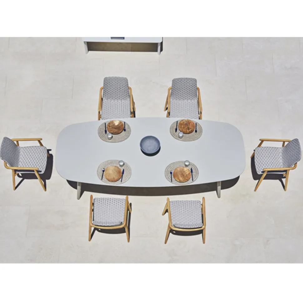 Structure in teak, upholstery in a selection of outdoor fabrics or flat ribbon strap in white