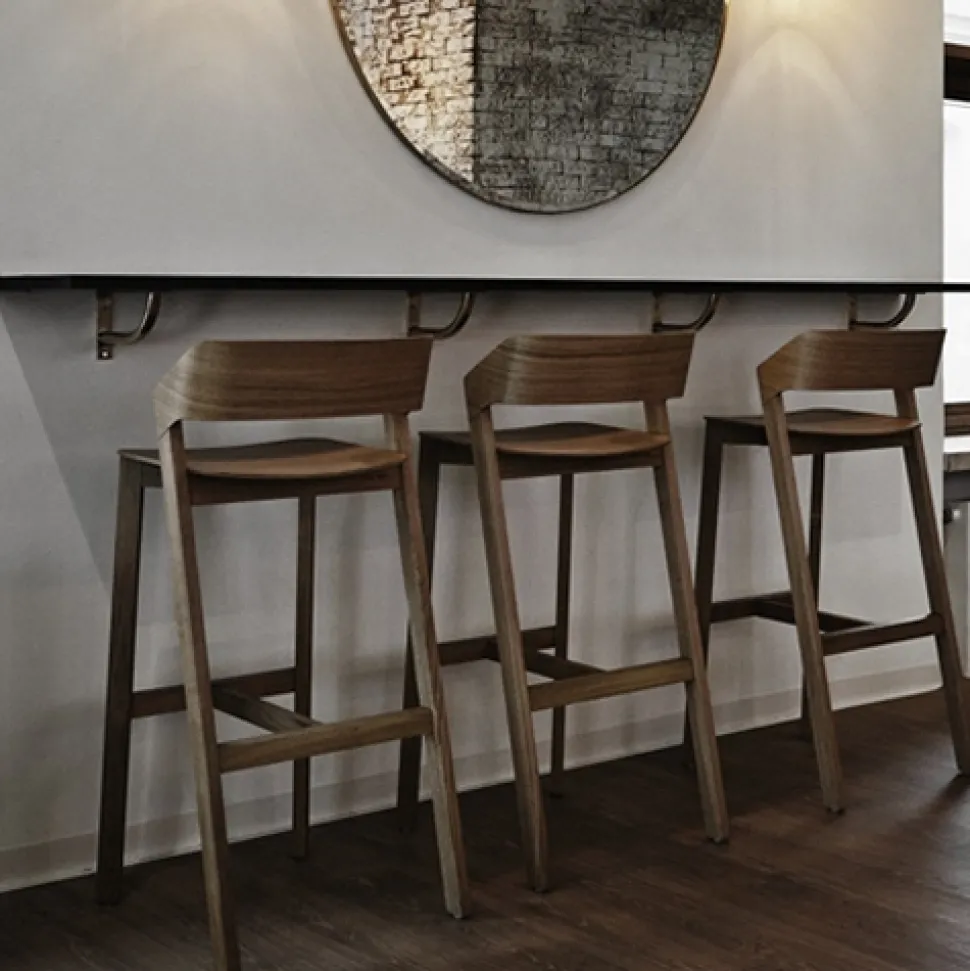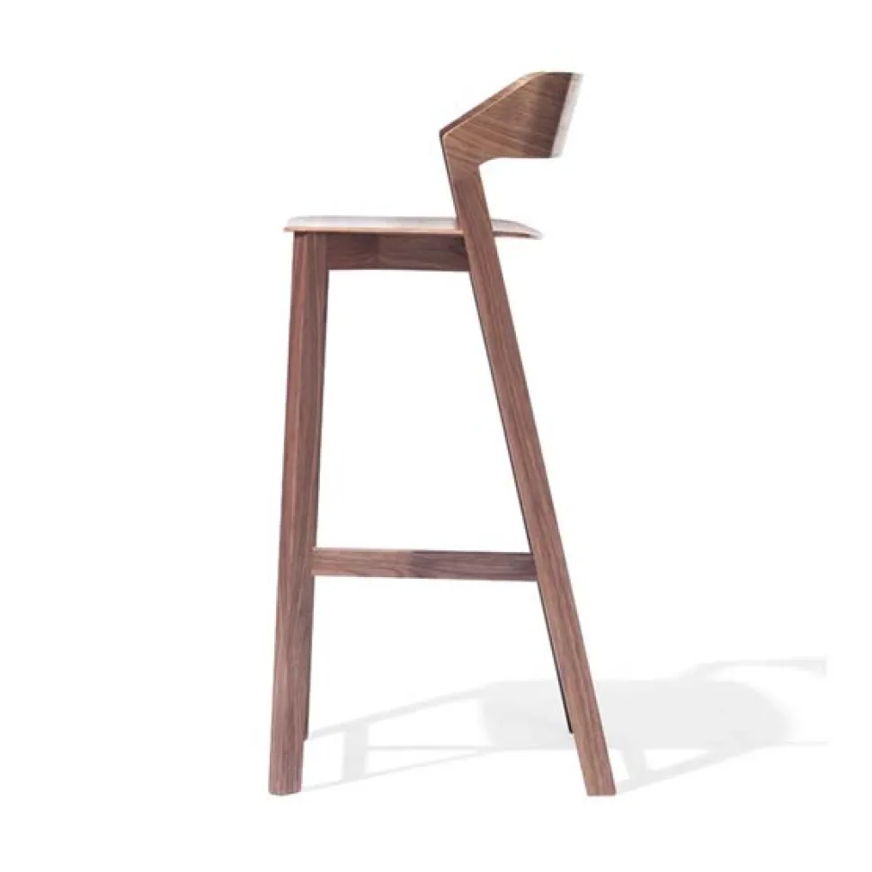 The Merano bar stool combines the bottom design made of solid wood with harmonic shapes of bent plywood in the seat and backrest. Thanks to the production technology used, it is remarkably light and does not contain any screws or metal pieces. Together with the chair and the low bar stool design, it creates a set with the Merano armchair.