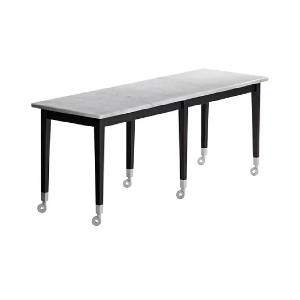 Base in ebonized mahogony base with cast aluminium cap and castors, top in white marble