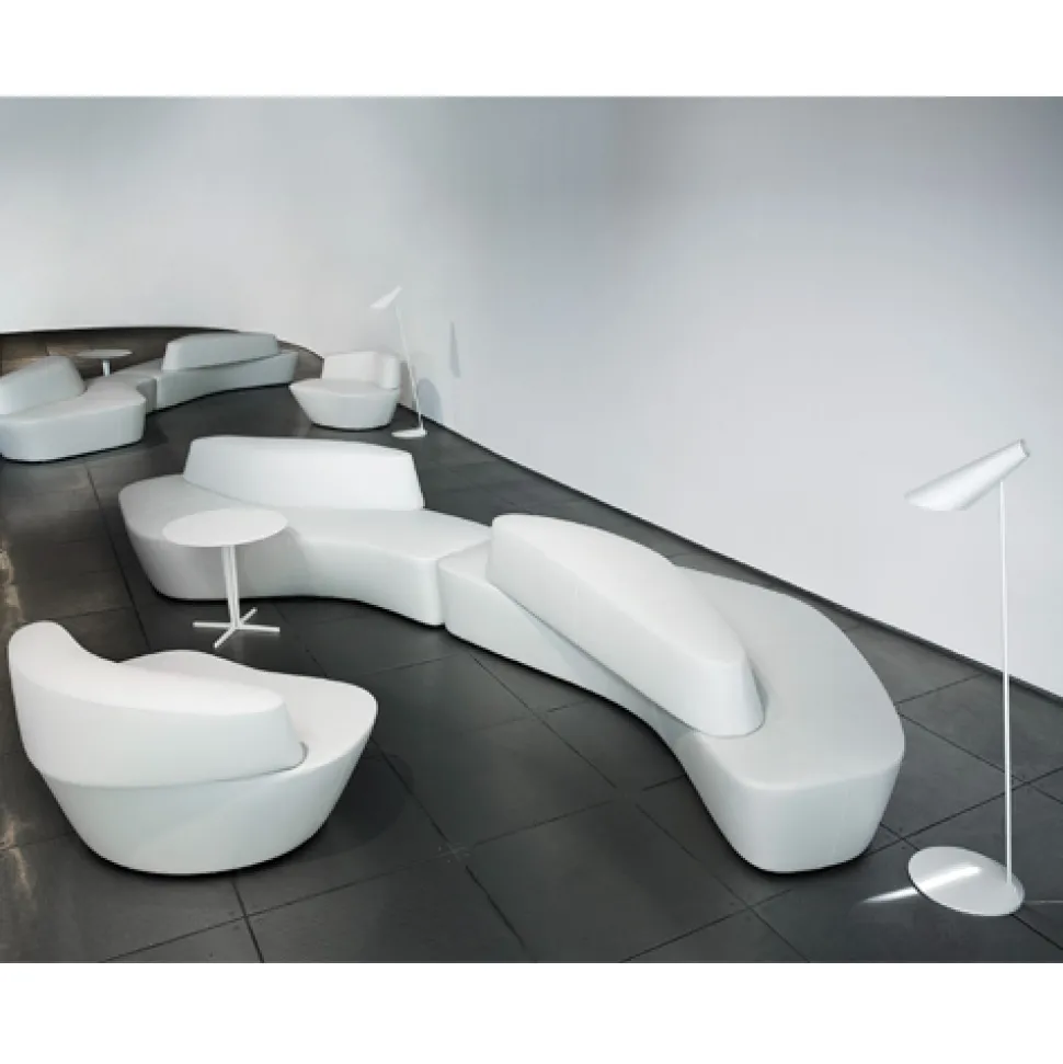 Polar is inspired by the shear forms of the ice caps in the arctic seas, thus giving life to an extremely versatile seating system. The seats and backrests , characterized by their full and sheared forms can be coupled together in a variety of ways, creating numerous seating layouts or options. The system is completed by a rather beautiful lounge chair and an original accessory which can be used as a seat or side table.