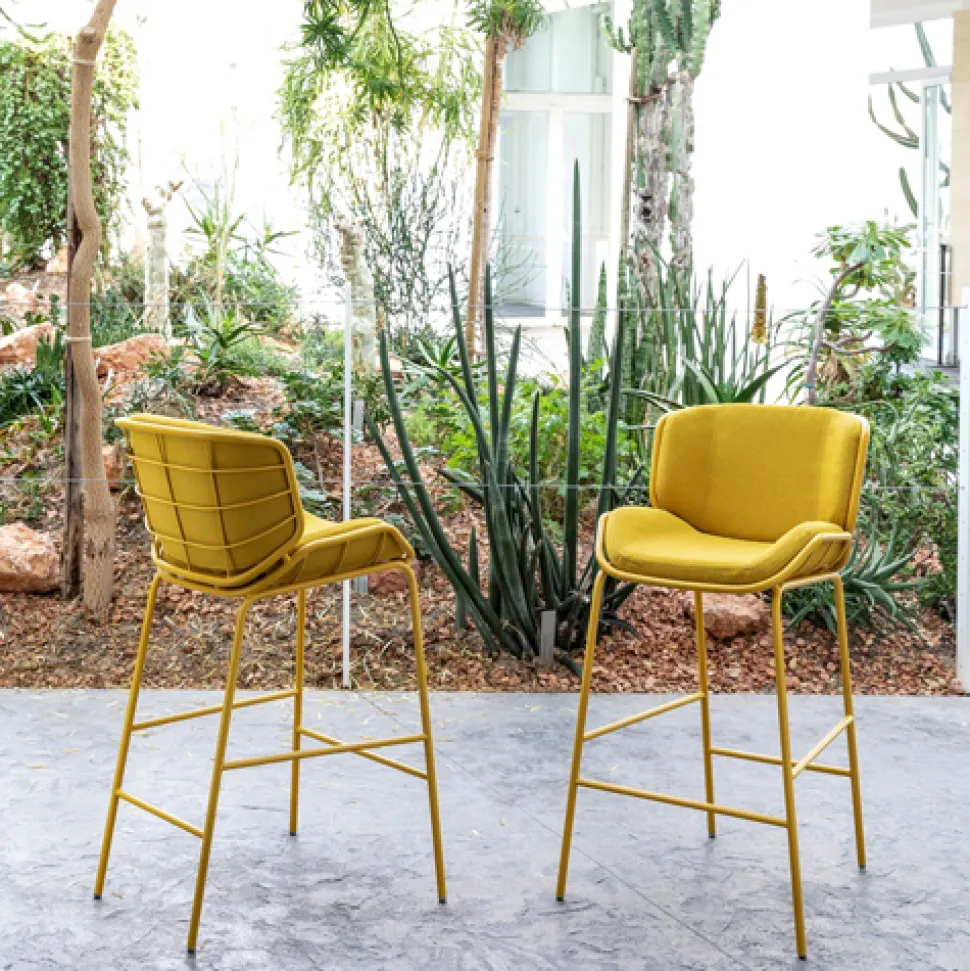 The harmonic and enveloping shells in powder-coated metal tubing that define the Skin armchair – designed by Giacomo Cattani – evolve and transform themselves to compose a real collection. The play of colors – a plus that defines the Trabà production – can be emphasized by the many options in terms of shades and fabrics for the padding of the shell: the choice for indoor and outdoor, leather, imitation leather to create pleasant ton-sur seats -ton or bolder contrasting games.