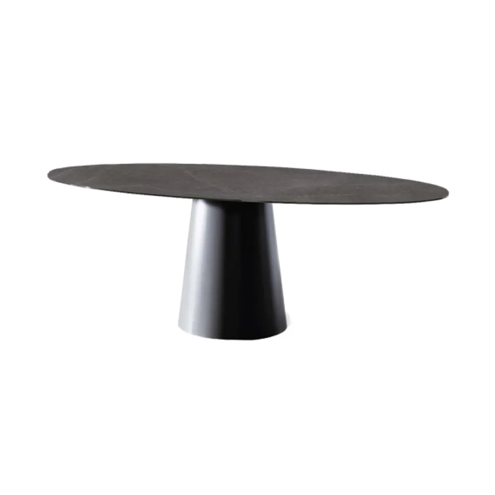 A lacquered metal base meets a top in glass, wood, ceramic or Materia, to give life to a tables collection with a distinctive personality and versatility in the setting, from home to contract spaces.