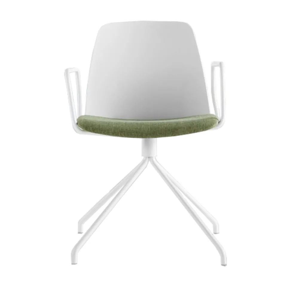 Swivel, base in metal and arms lacquered or in chrome, seat and back in polypropylene, optional seat upholstery in a selection of fabrics or leather
