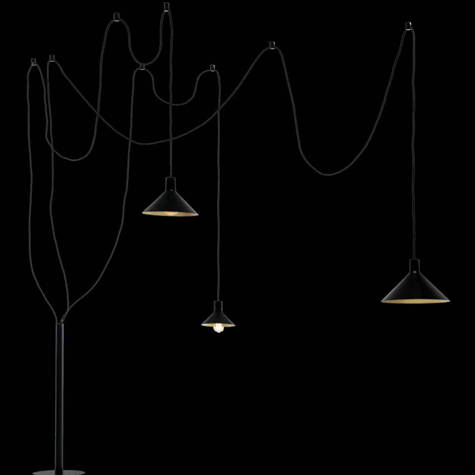 Floor lamp with black metal base available with 3 or 5 lampshades. It doesn?t require a ceiling light point. The arrangement of the hanging points on the ceiling is free and you decide on the basis of where you want to provide the light point.