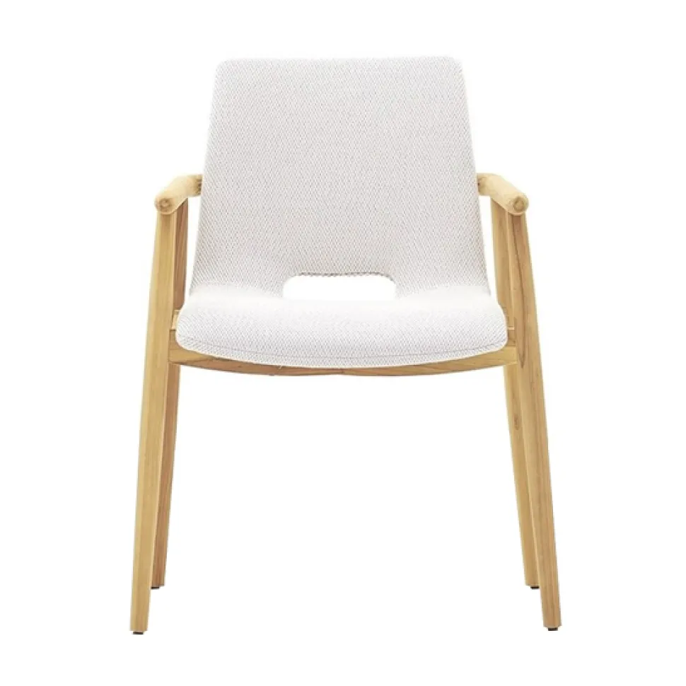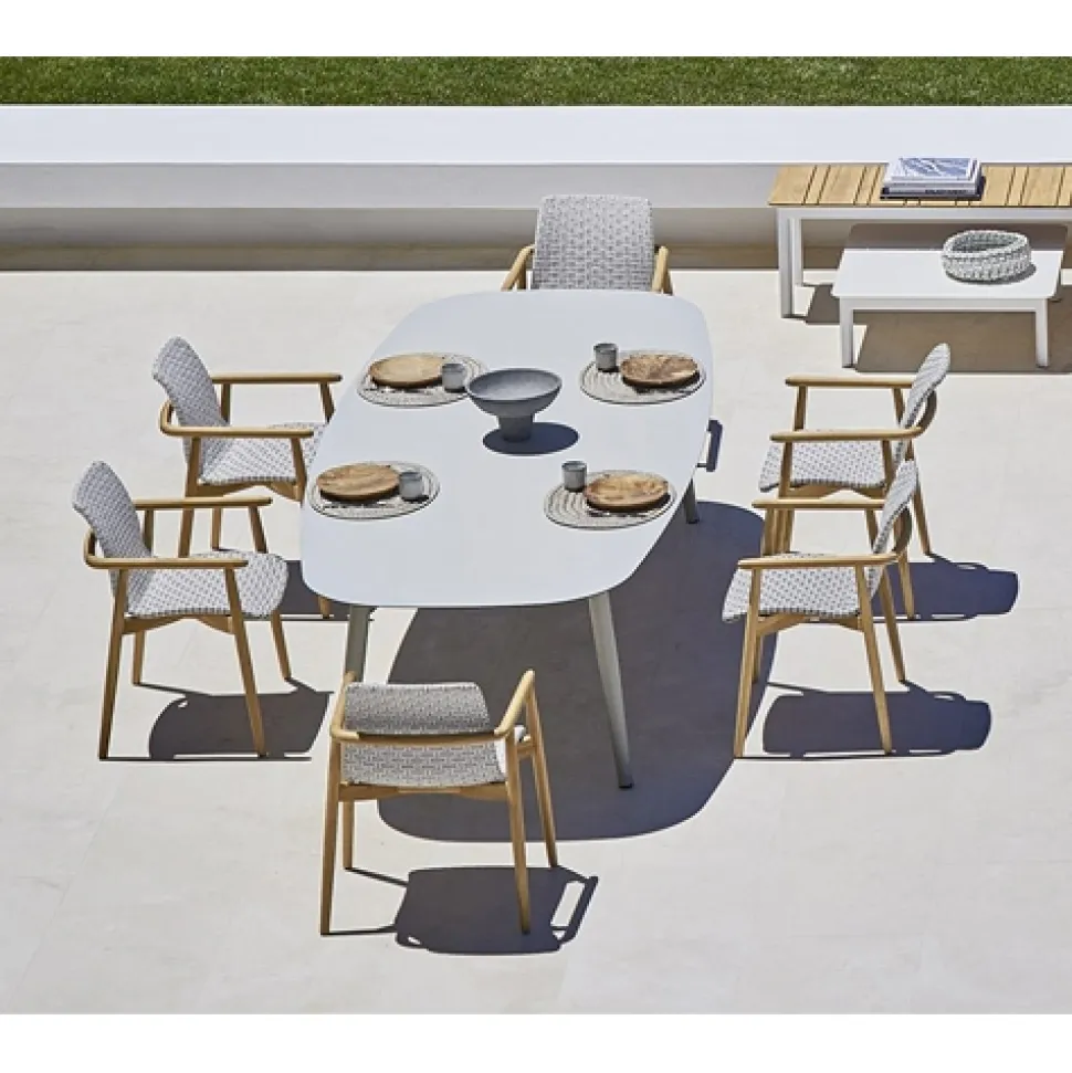 Structure in teak, upholstery in a selection of outdoor fabrics or flat ribbon strap in white