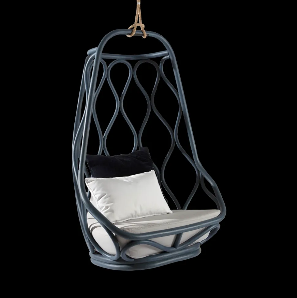 Structure in rattan in natural or stained in a selection of colours, upholstery and cushions in a selection of fabrics or leather, optional anti-swing rope with floor mount