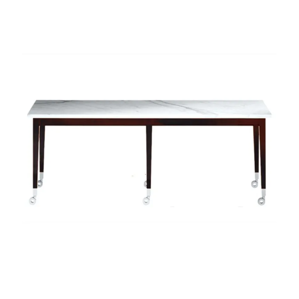 Base in ebonized mahogony base with cast aluminium cap and castors, top in white marble