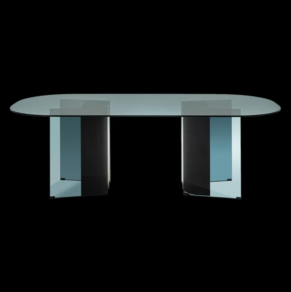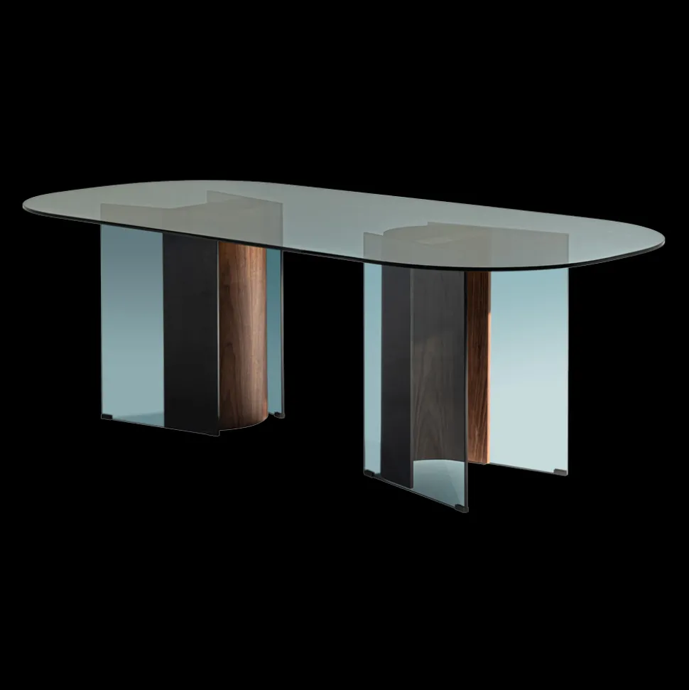 Structure in tempered glass tinted grey with wood in walnut or stained oak veneer